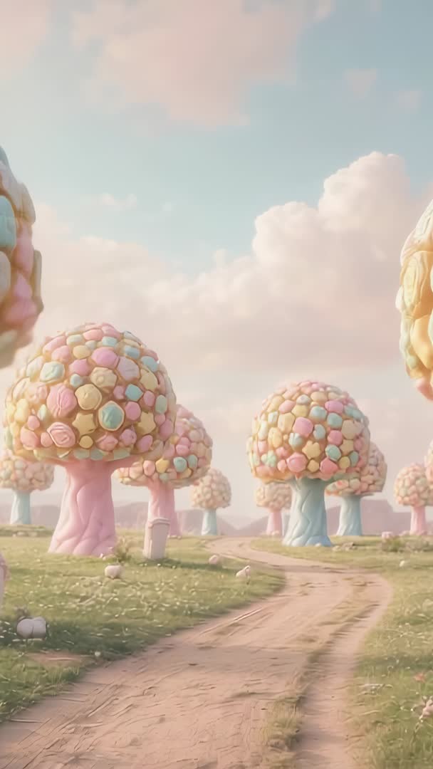 AI Generated Video. Vertical video showing tracking camera moving forward along dirt path through pastel meadow filled with candy-like trees, each canopy formed from colorful spherical sweets levitating above slender pastel trunks. Soft golden-hour light and cotton-candy sky are creating dreamy, whimsical mood while gentle breeze is animating grass and scattered candy stones. Footage is working well as loopable background for vertical social ads, app intros, Instagram Stories, or TikTok content, and is serving as charming opener for children's storytelling, animated title sequences, confectionery branding, and game or VR concept reels. Colorful, calming composition is evoking playful wonder and is allowing easy overlay of text, logos, or product shots for promotional use.