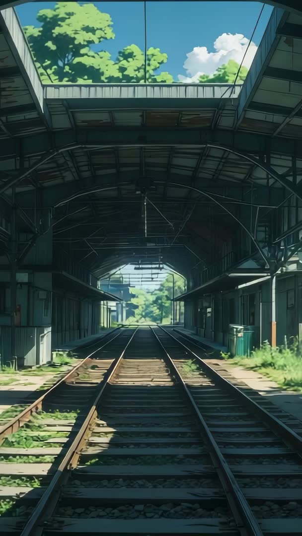 AI Generated Image. Vertical footage showing sunlight streaming through metal canopy onto rusted rails and empty platform, framed by leafy treetops under clear blue sky. Scene conveying nostalgic, desolate mood through contrast of industrial structure and vibrant greenery. Composition offering deep perspective and strong leading lines, suiting establishing shots, travel sequences, urban exploration montages, cinematic transitions, mobile vertical backgrounds. Use for film and video projects needing melancholic or reflective atmosphere, social media vertical ads, short form storytelling, app splash screens, title overlays, architecture and infrastructure presentations. Color palette blending warm sunlight highlights, cool shadow tones, muted metal textures, fresh greens for seasonal summer feel. Suitable for commercial and editorial licensing across advertising, editorial features, travel campaigns, music videos, online banners, and creative projects.