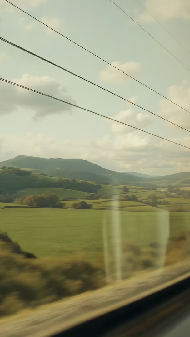 AI Generated Image. Video showing view from moving train window with overhead wires slicing across sky and reflections on glass. Motion blur conveying speed while rolling hills and patchwork fields slide past. Soft light and scattered clouds creating calm, nostalgic mood. Composition working well for travel sequences, transport infrastructure segments, or scenic background for social media reels. Ideal for website hero clips, travel vlog intros, documentary B-roll, rail company promos, or environmental and rural lifestyle projects. Recommending 9:16 vertical crop and short clip edits for mobile-first platforms and quick social ads.