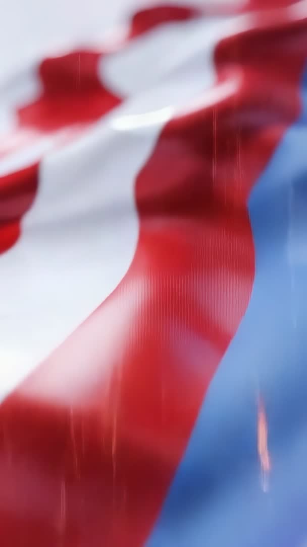 AI Generated Image. Showing close-up vertical footage of tricolor flag rippling in light rain, red white blue bands flowing over textured fabric. Capturing raindrops sliding across wet fabric and subtle light reflections, creating cinematic patriotic mood. Ideal for use in patriotic campaigns, election coverage, national holiday content, weather reports, background for title sequences, social media reels, and mobile-first video ads. Works well as loopable background for websites, broadcast lower thirds, promotional reels, documentary openers, and event projection. Recommended edits: apply slow motion, enhance red and blue contrast with color grade, add ambient wind and rain sound for realism. Vertical aspect ratio optimized for mobile and social platforms.