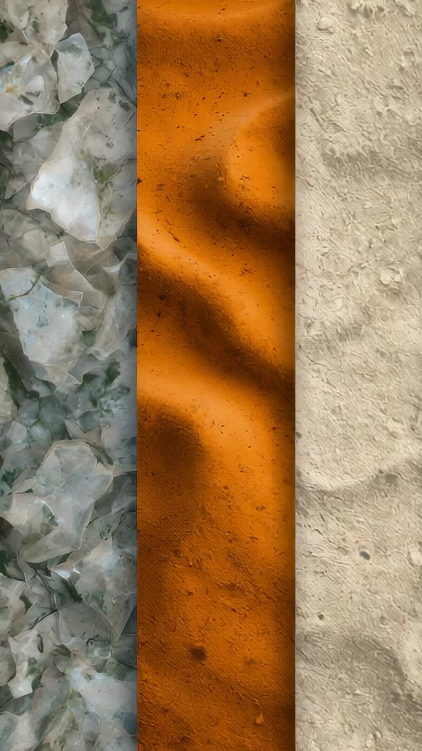 AI Generated Video. Vertical video presenting narrow triptych of three tactile panels. Center panel featuring warm amber sand with soft ripples, granular detail, and subtle shadowing. Left panel displaying translucent frosted glass shards with pale green highlights and crystalline facets. Right panel presenting rough beige parchment texture with visible fibers and weathered marks. Color palette balancing warm center tones with cool left tones and neutral right tones for strong contrast and visual depth. Footage suiting social media reels, vertical ads, mobile wallpapers, and motion graphic backgrounds. Use for product showcase, branding campaigns, interior design mood boards, packaging mockups, editorial openers, and website hero animations. Looping clip offering seamless texture motion for overlay, split-screen layouts, parallax transitions, or subtle ambient backgrounds. Suggest color grading, text overlay, and gentle speed ramping to enhance cinematic feel and integrate with title sequences or product reveal scenes.