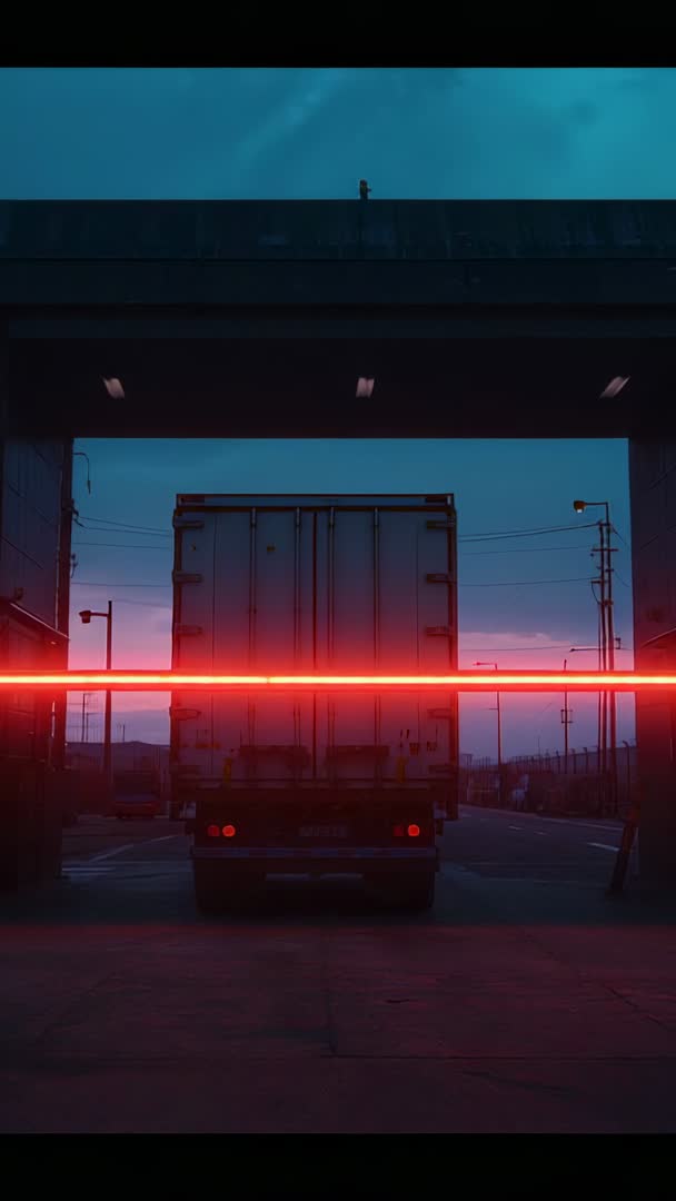 - Vertical truck passing under overpass at dusk with neon red beam slicing across cargo door