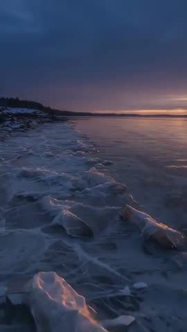 AI Generated Video. Vertical video showing camera moving along frozen rocky shoreline at twilight, revealing sculpted ice ridges catching warm horizon glow. Composition emphasizing textures of glassy ice, wet rocks, and smooth reflective water under moody blue-purple sky. Footage suiting mobile vertical content, social media stories, travel promos, nature documentary openers, seasonal advertising, and environmental awareness campaigns. Use for title sequences, background loops, meditation apps, website hero banners, or Instagram reels requiring cinematic winter atmosphere. Color palette blending cool blues and warm oranges, supporting mood boards and color grading references. Editing tips: keeping horizon level, preserving highlights on ice, delivering in vertical 9:16 format at high bitrate for smooth gradients and crisp detail.