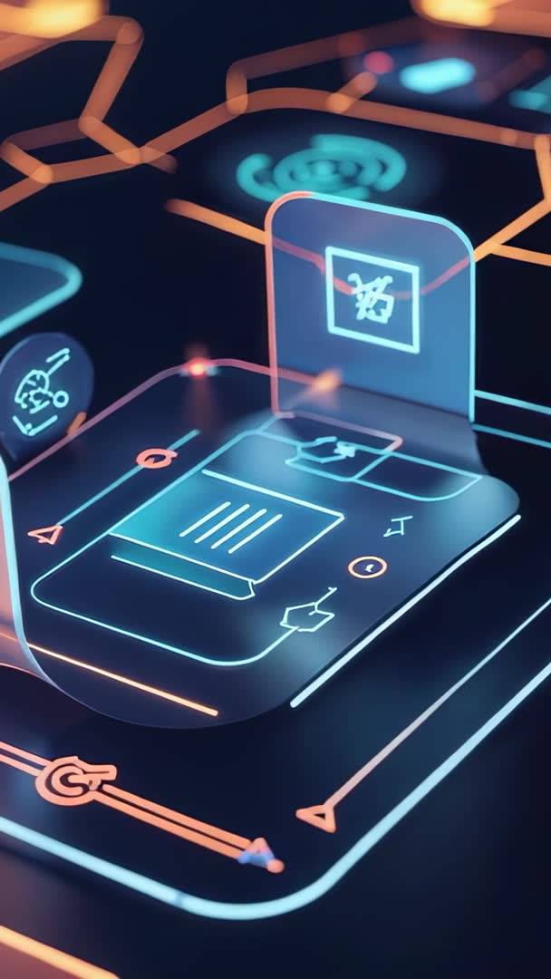AI Generated Image. Vertical 9:16 video showing futuristic UI grid panel flipping tab to reveal crossed-out icon while neon lines are linking network nodes. Visual featuring glowing blue and orange outlines, translucent 3D panels, shallow depth-of-field, and subtle motion trails for modern tech aesthetic. Scene offering clear visual language for disabled or blocked function, node connectivity, and network routing concepts. Fitting for tech presentations, mobile app demos, UI walkthroughs, cybersecurity explainers, blockchain concept videos, startup pitch decks, social media reels, vertical ads, and website hero loops. Editing suggestions: loop seamlessly for background usage, slow motion for emphasis, overlay captions or voiceover for narration, swap color palette to match brand, and place logo or call-to-action on top panel for product promos.
