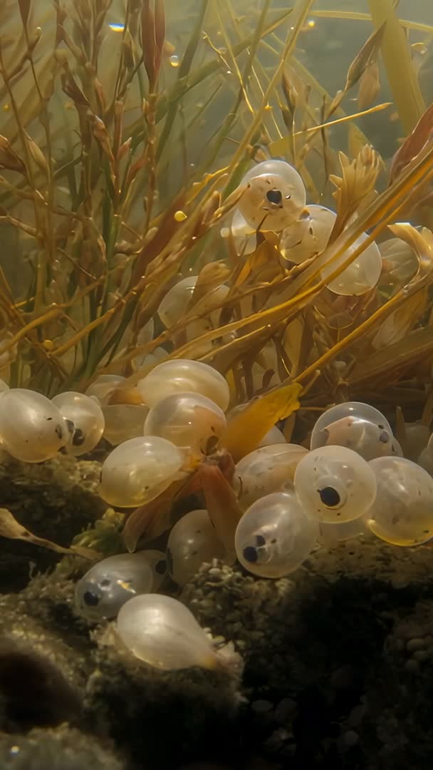 - Vertical underwater video revealing translucent kelp egg capsules with developing embryos