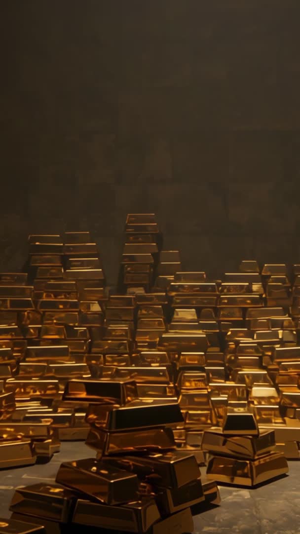 AI Generated Image. Camera revealing large stacks of gleaming gold bars inside secure vault interior, warm cinematic lighting creating glossy reflections and deep shadows. Composition placing heavy pile of bars at lower frame, leaving ample negative space above for titles, logos, or text overlays. Footage suiting finance and luxury projects: promoting investment services, bullion dealers, banking campaigns, economic news openers, documentary sequences on wealth and precious metals. Vertical orientation optimizing mobile-first platforms such as Instagram Reels, TikTok, and Stories; ideal for short-form ads and social promos. Editors applying slow push-in, parallax, or speed ramping to heighten drama; color grading enhancing warm gold tones; adding ambient vault hum or cinematic sting for atmosphere. Usage suggestions include commercial ads, corporate presentations, website hero clips, broadcast intros, educational content about bullion storage and asset diversification, and background for financial commentary. Technical tip: keep key graphics within lower third area to preserve negative space at top for branding or captions.