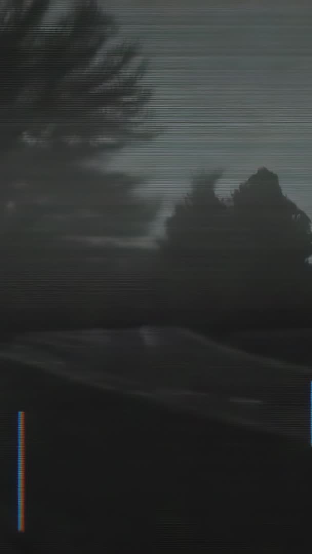 - Vertical VHS-style forest drive at dusk with flickering scanlines and glitchy atmosphere