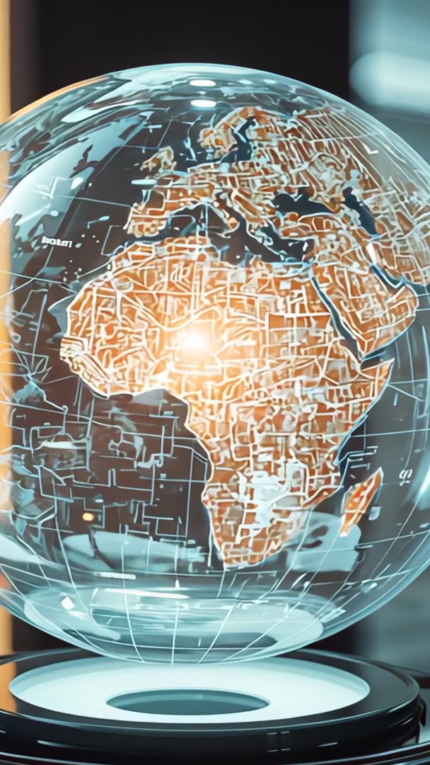 AI Generated Image. Vertical 9:16 clip showing activating holographic globe with detailed circuit map focusing on Africa and Europe. Globe rotating above illuminated base and emitting neon blue and amber glow, creating high-tech lab atmosphere. Fine lines and grid overlays representing data channels and network topology, offering strong visual metaphor for connectivity, digital infrastructure, and innovation. Ideal for tech product launches, corporate presentations, cybersecurity trailers, startup pitch decks, app intros, social media vertical ads, exhibition displays, and science documentary openers. Composition and lighting working well for overlaying text, logos, lower thirds, animated UI elements, and voiceover integration.