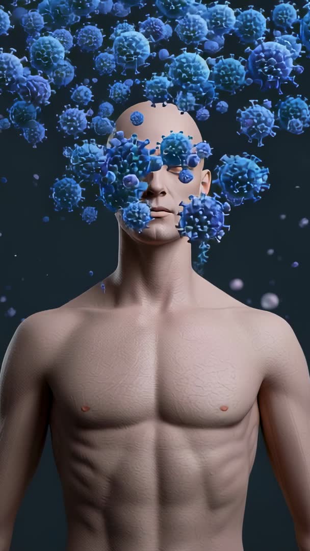 AI Generated Image. Opening shot showing bare-chested model facing dense swarm of blue viral spheres floating and swirling in dark void. 3D-rendered particles orbiting head and upper chest, creating intense, futuristic visual metaphor for infection, immune response, digital threat, or biological simulation. Vertical framing optimized for mobile-first platforms, with slow-motion particle movement and cinematic depth that emphasize scale and tension. Color palette focused on cool blues and muted skin tones for high contrast and modern tech feel. Suggested uses: background for medical or biotech presentations, title sequence for science and technology documentaries, social media campaign about infection prevention or vaccine research, promotional video for health tech startups, conceptual editorial on pandemic impact. Also suitable as looped motion background for landing pages, app intros, vertical ads, or B-roll in news segments. Visuals and timing configurable for branding, voiceover, or on-screen text overlays.