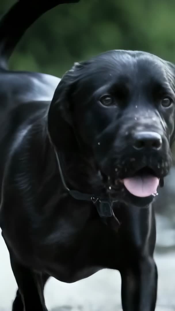 AI Generated Image. Close-up vertical video showing black Labrador running through shallow creek, splashing water and panting with tongue out. Collar tag visible on wet coat, blurred green foliage creating natural backdrop. Vertical framing and dynamic forward motion creating immersive mobile-first clip. Use for social media reels, mobile ads, pet brand promotions, outdoor lifestyle campaigns, dog training tutorials, veterinary clinic marketing, B-roll for nature or travel videos. Suggestion for editors: trim to 10-30 seconds, add upbeat music, apply slow-motion to splash frames, overlay logo in upper or lower third, color grade for richer contrast and glossy fur highlights. Clip working well as hero shot for pet product commercials, playful intro for dog-related content, or energetic cutaway in adventure storytelling.