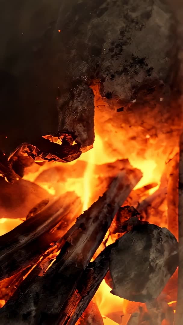 AI Generated Image. Showing burning logs inside firebox, close-up of glowing embers, flickering flames, rising smoke and flying sparks. Presenting strong warm orange tones and charred texture, creating dramatic cozy mood. Featuring vertical framing optimized for mobile platforms and social reels. Suited for social media reels, TikTok and Instagram stories, background loops for relaxation or ASMR fireplace content, promo clips for wood stoves and heating products, cabin or lodge marketing, seasonal holiday campaigns, film and TV interior transitions, textured overlays for motion graphics. Offering editing tips: using slow-motion or speed ramping for cinematic feel, applying color grading to enhance warm highlights, adding subtle crackling audio for immersive sound. Including loop-friendly segments for seamless repeating and mobile-first storytelling.