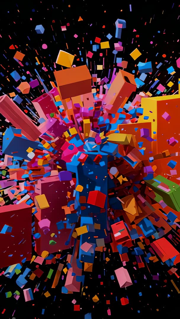 AI Generated Image. Vertical video showing central blue core bursting into colorful cubes and prisms against black void. Explosion conveying dynamic motion, depth, and kinetic energy with bright saturated palette. Ideal for use as background in music video intros, tech product launches, app launch screens, social media stories, event visuals, promotional reels. Useful for motion graphics projects, VJ loops, title sequences, UI animations needing bold abstract geometry. Rendering crisp 3D shapes and particle detail, suitable for looping, slow motion, or speed ramp edits. Allowing easy color grading and audio-driven animation to enhance visual impact.