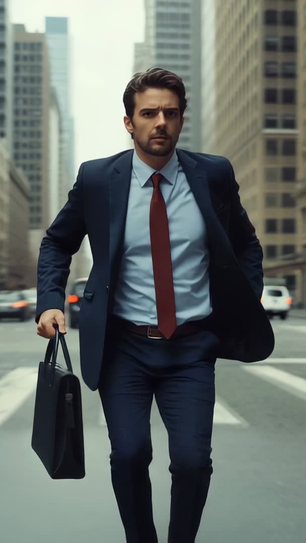 AI Generated Video. Clip showing businessman running across downtown crosswalk while carrying leather briefcase, conveying urgency and determination. Vertical cinematic framing and shallow depth of field emphasizing motion and fast-paced urban commute. Ideal for commercial intros, corporate website hero, LinkedIn ads, startup promo, time-management articles, news segments about commuting and work culture. Editors placing into B-roll for business presentations, finance videos, recruitment campaigns, or short-form social content like Instagram Reels and TikTok.