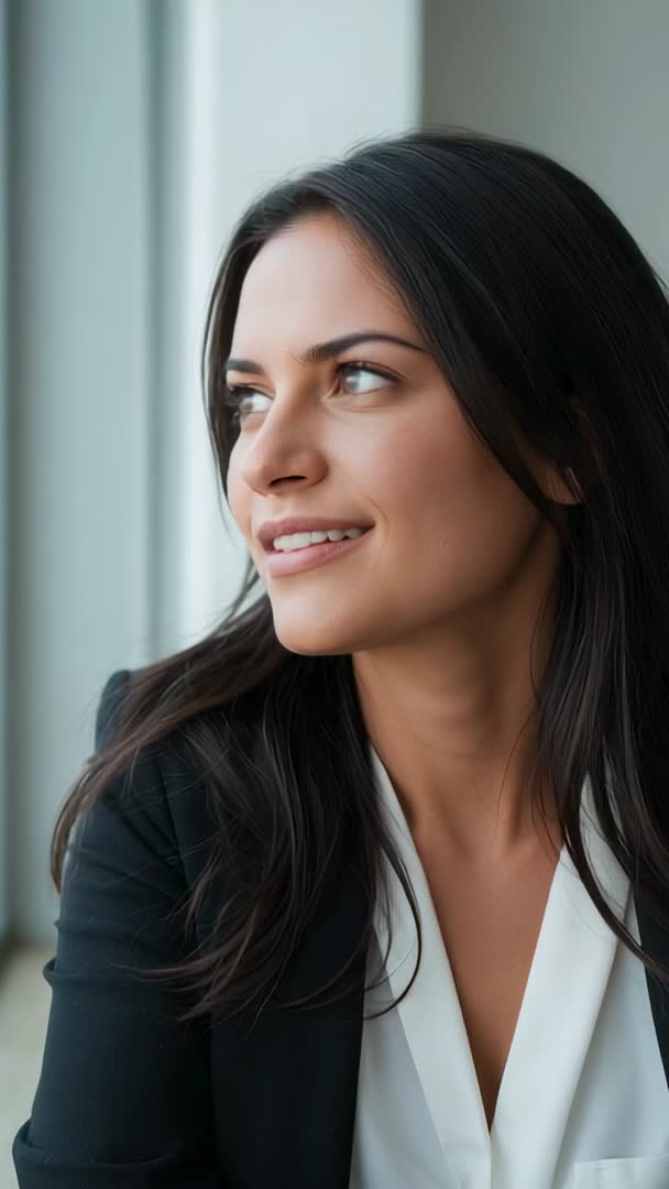 AI Generated Video. Showing businesswoman turning head and reflecting while gazing out office window. Close-up vertical clip capturing calm confident expression, natural light on face, soft background blur creating modern professional feel. Suitable for corporate video, leadership messaging, recruitment campaigns, executive profiles, mindfulness and mental health content. Works well as hero footage for website, vertical social ad, LinkedIn video, pitch deck, office culture montage. Using slow pan or gentle zoom to emphasize introspective mood and narrative. Color grading suggestions: using warm neutral tones to highlight approachable professional vibe. Duration: short vertical clip suitable for mobile-first campaigns, Instagram Reels, TikTok content, and story ads.