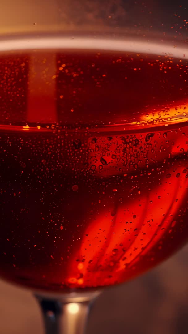 AI Generated Image. Capturing amber-red wine with delicate bubbles rising along glass walls and warm reflections. Featuring tight vertical composition and shallow depth of field, creating cinematic moody atmosphere. Highlighting sparkling effervescence and liquid texture for luxury beverage campaigns, bar branding, cocktail tutorials. Working well for social media vertical ads, Instagram Reels, Stories, TikTok, website hero videos, bar promos, product launches, editorial features. Providing abstract background for text overlays and title cards with rich warm tones and bokeh highlights. Suitable for use in beverage commercials, mixology content, restaurant menus, lifestyle blogs and packaging presentations.
