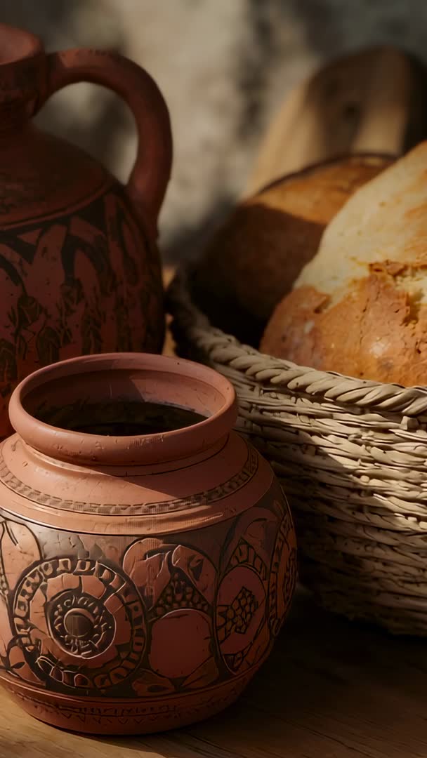 AI Generated Video. Vertical clip pulling focus from carved terracotta pot in foreground to wicker basket of artisan loaves in background. Warm natural light highlighting ornate etched patterns on clay surface and crumb texture of bread. Shallow depth of field creating intimate, tactile mood and strong foreground-background contrast. Serving as cinematic B-roll for bakery branding, artisan craft features, culinary tutorials, vintage home decor campaigns, social media Reels and TikTok. Suiting looping background, website hero panels, cookbook openers, farmer market promos, product packaging mockups. Color palette favoring warm, earthy tones complementing rustic brand identities.