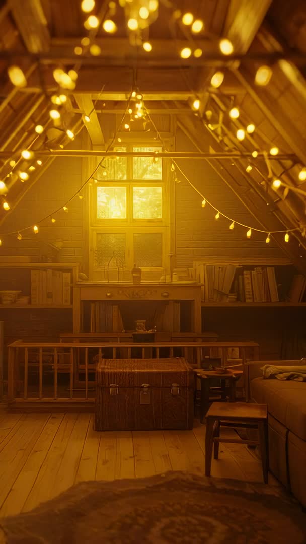 AI Generated Image. Capturing soft golden light filtering through attic window, revealing wooden beams, fairy string lights, desk by window, stacked books, and vintage trunk. Pulling focus from foreground bokeh to midground workspace, creating cinematic vertical composition ideal for storytelling and mood vignettes. Offering warm, rustic atmosphere suited for lifestyle, interior design, cozy living, and relaxation themes. Perfect for vertical social media reels, TikTok, Instagram Stories, YouTube Shorts, and mobile-first advertising. Suggested uses include background B-roll for home decor vlogs, loft renovation promos, hygge campaigns, bookshop or publishing visuals, real estate listings for attic conversions, seasonal autumn and winter mood pieces, and product spots for candles, textiles, and furniture. Editing tips: color grade toward warm golden tones, preserve shallow depth of field to keep bokeh, add soft ambient music and slow vertical pan for cinematic effect.