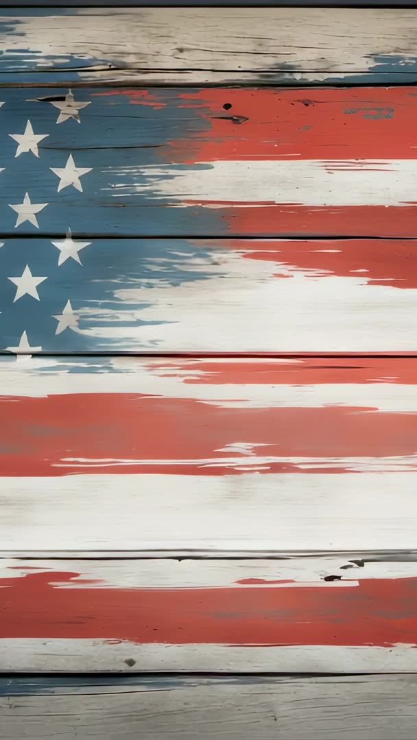 AI Generated Image. Showing close-up vertical video of distressed American flag painted on weathered wooden planks, featuring peeling paint, visible wood grain, and faded stars and stripes. Evoking rustic, vintage Americana mood suitable for patriotic storytelling and heritage themes. Working well for mobile-first content including Instagram Reels, TikTok, Snapchat, and vertical ads. Providing strong backdrop for headline text, logo animations, lower thirds, title cards, and call-to-action overlays. Ideal for holiday promos, Independence Day posts, Memorial Day tributes, Veterans Day campaigns, political or community event marketing, and small business craft branding. Featuring muted red, faded blue, off-white tones and grunge texture for authentic handcrafted look. Ideal technical use cases include 9:16 vertical format, looping background, slow pan, parallax effects, and cinematic crop for social and broadcast projects.