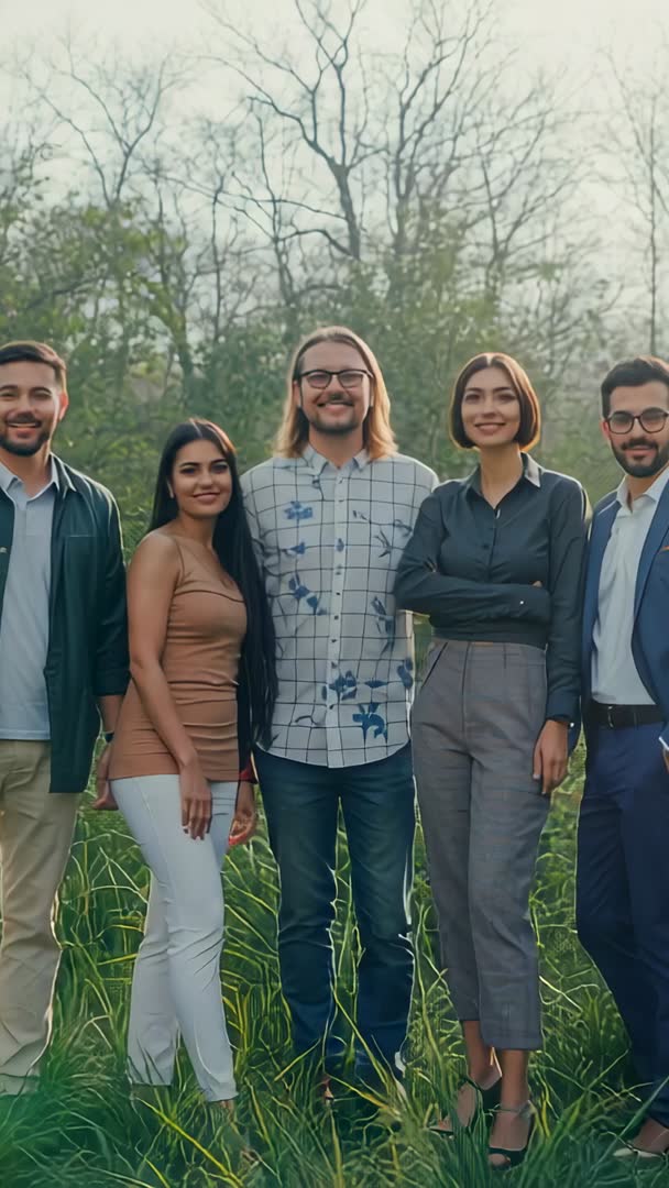 AI Generated Image. Vertical video featuring five professionals standing in grassy meadow with bare trees in background. Camera zooming and framing central trio while group smiling and posing. Wardrobe mixing business casual and smart casual, creating approachable corporate look. Natural light producing soft contrast and warm tones. Use for corporate promo, team introduction, recruitment campaign, social media vertical ad, leadership profile, outdoor workshop recap, sustainability or nature-focused brand content. Suggested edits include logo reveal, name lower thirds, upbeat soundtrack, cinematic color grade, subtle stabilization for smooth vertical playback. Ideal for mobile-first distribution on Instagram Reels, TikTok, LinkedIn stories, website hero banners.
