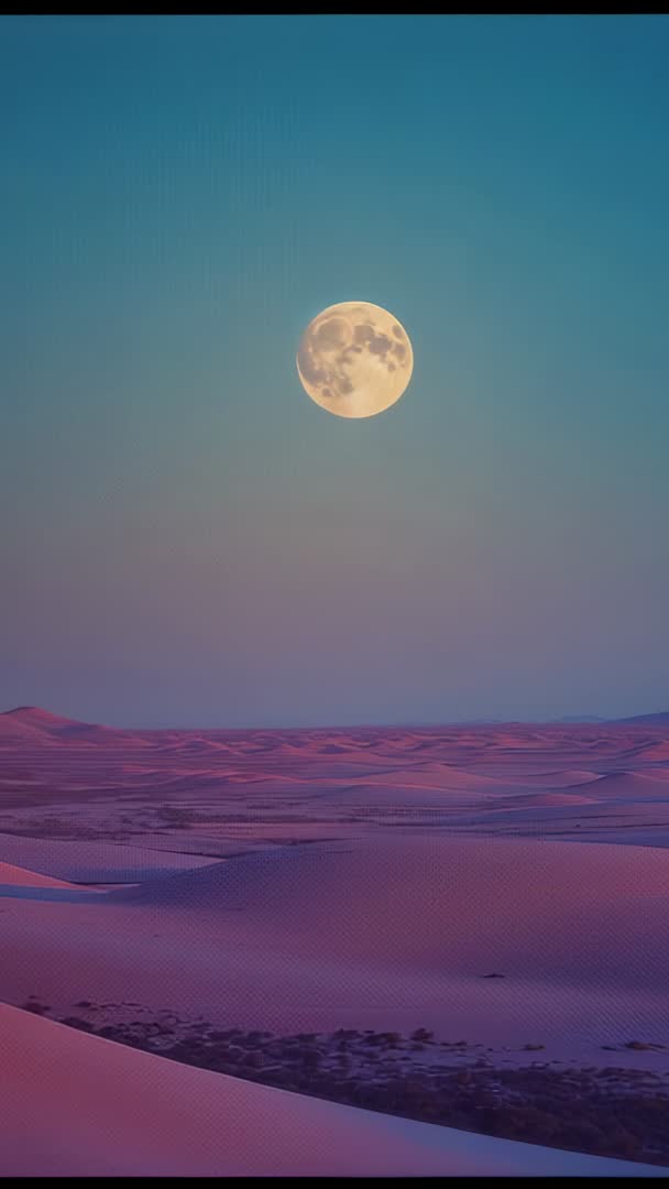 AI Generated Image. Vertical cinematic clip capturing full moon rising over twilight desert with pink sand dunes and soft pastel gradient sky. Providing calm, dreamy mood by combining warm moonlight with cool twilight tones. Working well for mobile vertical reels, social media stories, meditation and sleep apps, travel and tourism promos, background for inspirational quote overlays, website hero banners, and editorial layouts. Shot in 9:16 vertical ratio with compressed perspective emphasizing large moon scale. Offering color palette of mauve, pink and teal for brand mood boards and calming visuals. Suitable for use in advertising, ambient video loops, nature and astronomy content, and cinematic montages.