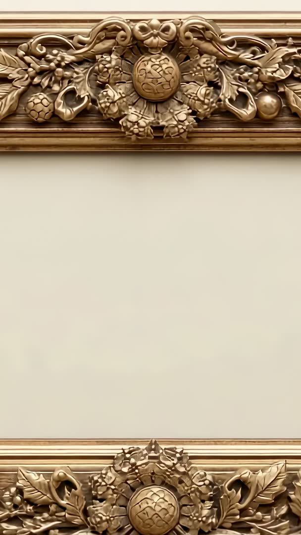 AI Generated Image. Drifting camera capturing gilded baroque molding and ornate medallion, creating cinematic reveal for vertical formats. Close-up framing showing intricate scrollwork, rosette and cornice, delivering rich texture and warm gold tones for luxury projects. Serving as background for vertical title cards, social media ads, museum exhibit promos, interior design portfolios, restoration case studies, product reveals. Pairing with slow ambient piano or soft strings, applying subtle vignette and gentle color grade to enhance gold tones, leaving central negative space clear for text or logo overlays. Suiting branding, historic architecture coverage, set decoration showcase, stock footage libraries.