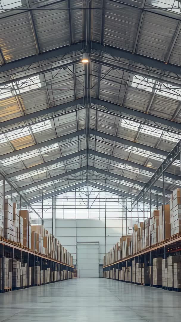 AI Generated Image. Vertical footage capturing expansive warehouse aisle with symmetrical pallet racking and stacked cartons under steel truss roof. Camera moving slowly down center aisle, revealing scale, organization, and clean polished floor. Natural and artificial light filtering through skylights, highlighting textures of metal beams and cardboard boxes. Visuals working well for corporate logistics presentations, supply chain training, fulfillment center promotions, facility tours, operational safety briefings, and industrial architecture showcases. Clip pairing easily with on-screen text, voiceover, or music for marketing campaigns, website hero banners, social media vertical ads, investor pitch decks, and internal process documentation. Post-production tips including neutral color grading, slight vignette for depth, and moderate slow motion for dramatic impact.