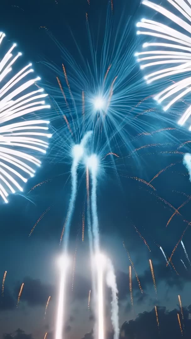 AI Generated Image. Capturing vertical 9:16 footage of launching shells bursting into radiant blue blooms above dusk treeline, leaving glowing trails and drifting sparks. Providing dramatic, high-energy visuals for holiday campaigns, festival promos, concert openers, and city celebration reels. Fitting mobile-first platforms such as Instagram Reels, TikTok, Snapchat, and vertical ad placements. Pairing with upbeat music or cinematic score for countdowns, event announcements, and brand activations. Allowing title, logo, and call-to-action overlays while preserving strong contrast between luminous shells and moody sky. Ideal for broadcast bumpers, social content, website hero loops, invitation motion backgrounds, and seasonal marketing assets.
