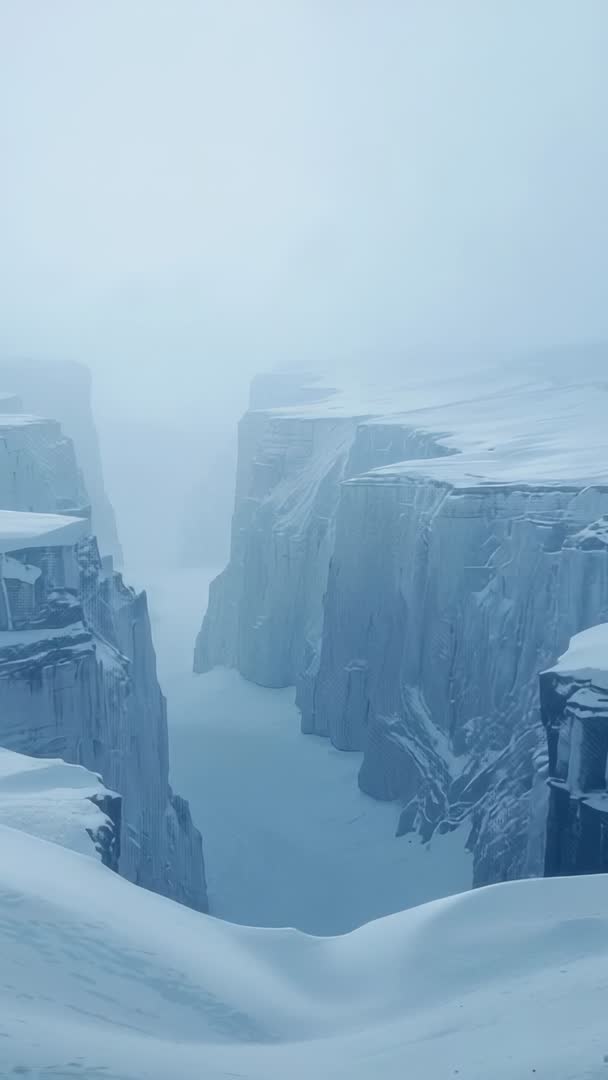 AI Generated Video. Vertical fixed-camera clip showing deep glacial canyon carved by ice, featuring towering icy cliffs and smooth snowdrift in foreground leading into mist-filled gorge. Pale blue palette and low contrast creating cold, minimalist mood conveying solitude and scale. Slow, steady framing allowing use as cinematic establishing shot, background for documentaries, climate change segments, travel promos, winter adventure films, and brand storytelling for outdoor gear. Vertical orientation optimizing mobile vertical stories, reels, social ads, and app backgrounds. Editors applying time remapping, slow zoom, cool-toned color grading, and ambient wind plus distant creak sound design for immersive, haunting atmosphere. Ideal for conveying extreme environment, frozen wilderness, remoteness, scientific exploration, or moody winter campaigns.