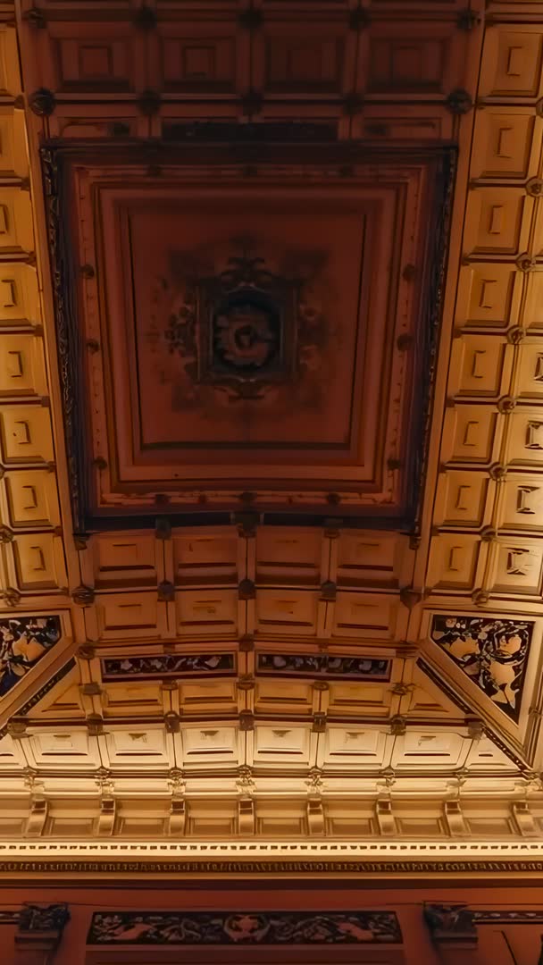 - Vertical video capturing ornate coffered ceiling with central medallion and warm rising light