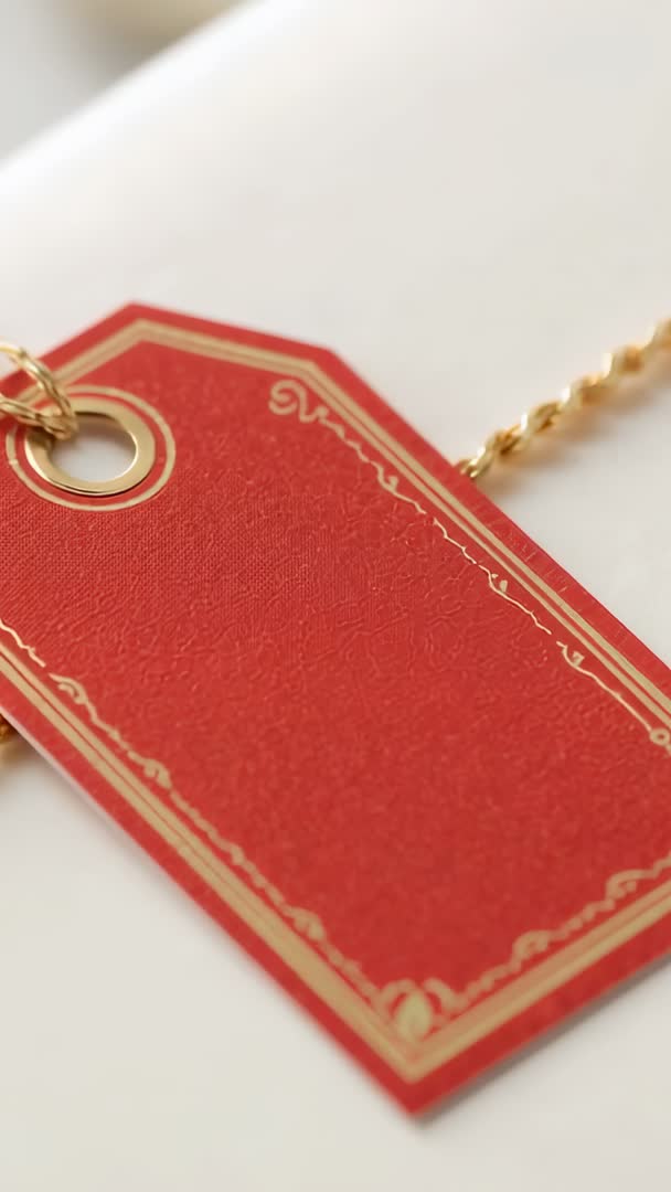 AI Generated Video. Shifting camera capturing rotating red tag on white surface, revealing gold eyelet and chain. Close-up focusing on textured cardstock and metallic details, offering tactile luxury feel. Vertical format optimized for social reels, stories, mobile ads, and e-commerce clips. Useful for holiday promotion, gift wrap showcase, price reveal, branding mockup, packaging reveal, retail advertising, and product detail montages. Pair with overlay text, animated logo, or color grading for seasonal sale announcement or premium product launch. Loopable motion enabling seamless background for website hero, store signage, or in-store display. Neutral white backdrop enabling easy compositing and copy placement.