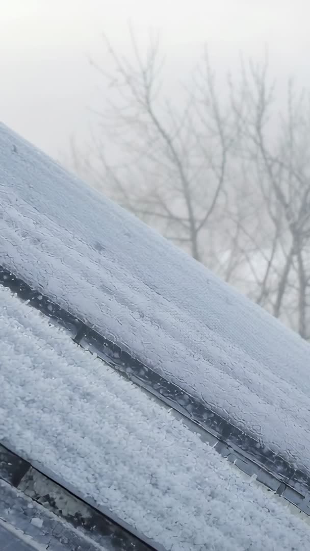 AI Generated Video. Vertical video showing close-up of snow-covered photovoltaic panels on residential roof after fresh snowfall, with bare deciduous trees visible in background. Water droplets and ice crystals collecting along panel seams, muted winter light from overcast sky, close framing emphasizing texture and accumulation. Scene conveying cold weather impact on solar performance, winter roof maintenance, and seasonal energy considerations. Suited for renewable energy articles, solar company marketing, winter maintenance guides, weather reports, environmental presentations, vertical ad campaigns, social media reels, documentary b-roll, technical training for installers, and editorial content about clean energy challenges in cold climates. Technical notes: vertical orientation 9:16, close-up composition, shallow depth of field on panel surface, soft natural light for atmospheric mood.