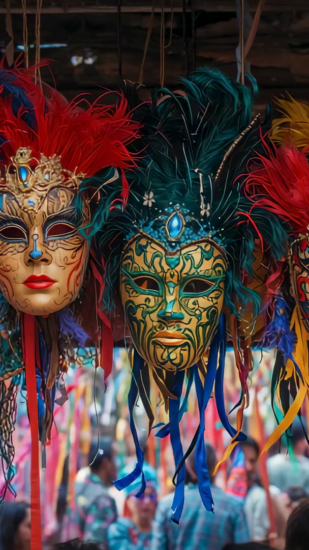 AI Generated Image. Vertical footage capturing three ornate carnival masks hanging from vendor stall, swaying in breeze while colorful ribbons flutter and crowd in bright costumes passing in background. Focusing on intricate mask details, feathers, gemstone accents, and hand-painted patterns with shallow depth for strong subject isolation. Working well for festival promotion, travel content, parade coverage, event teaser, social media vertical ads, craft market features, cultural documentary segments, and background for title overlays. Recommending looping short clip for Instagram Reels or TikTok, pairing with upbeat carnival music, and using slow motion to emphasize ribbon movement. Color grading tips: boosting saturation and contrast to enhance jewel tones and using selective sharpening on mask details. Serving as opener for event videos, header for festival websites, product showcase for artisan mask sellers, and stock clip for travel and culture packages.