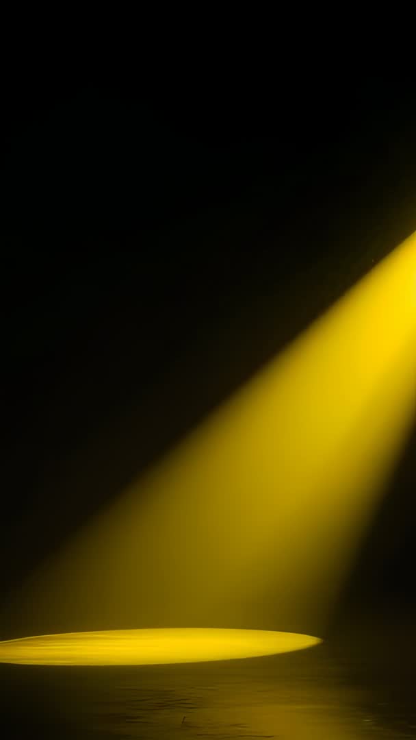 AI Generated Video. Featuring warm amber spotlight casting diagonal beam across empty stage and forming round illuminated pool on floor. High contrast between deep black background and vibrant yellow glow, creating dramatic mood for performance, promo, or title sequence. Vertical 9:16 orientation fitting social media stories, mobile ads, and reel intros. Leaving ample negative space in upper frame for overlay text, logos, or countdown graphics. Suggesting uses: opening shot for concert or theater promo, background for event announcement, title card for stage production, transition element in video edits, hero frame for mobile landing pages, atmospheric backdrop for product showcase. Recommending color grading to enhance warmth, adding subtle grain or fog for cinematic feel, and looping short clip for continuous ambience. Providing strong focal area on illuminated floor for product placement or performer reveal.