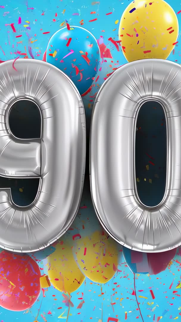 - Vertical video celebrating 90th birthday with silver foil balloons drifting through blue confetti