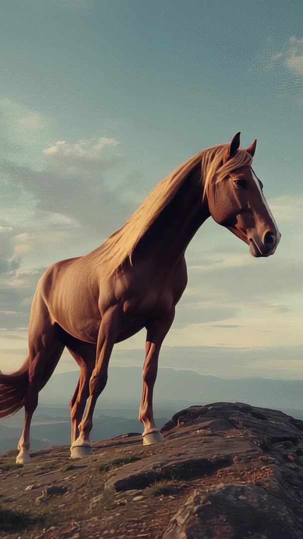 AI Generated Image. Vertical clip showing chestnut horse standing on cliff edge, mane blowing in wind and eyes scanning distant hills under warm golden-hour light. Framing vertical, offering cinematic composition ideal for mobile-first platforms, vertical social media, and phone wallpapers. Suiting equestrian brand campaigns, travel and outdoor adventure promos, nature and wildlife segments, inspirational or wellness videos, editorial spreads, book covers, and website hero banners. Pairing with ambient soundtrack or soft piano, adding slow cinematic color grade, using subtle text overlays or logo in top third. Providing strong themes of freedom, strength, solitude, and connection with nature, and offering easy adaptation for reels, stories, trailers, and marketing hero clips.
