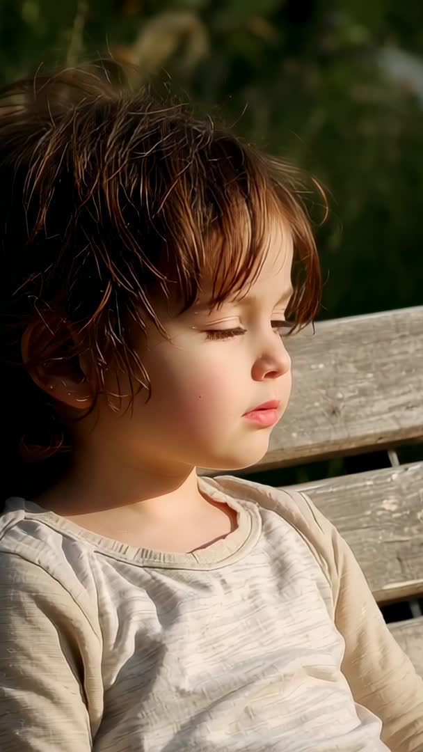 AI Generated Video. Video showing young child resting on weathered wooden bench in park, eyes closed and face tilted toward warm sunlight. Gentle breeze moving soft hair and creating calm, contemplative mood. Vertical orientation and tight profile framing crafted for mobile-first content. Ideal for parenting, family lifestyle, wellness, mindfulness, sleep routine, outdoor leisure, summer campaign, social media reels. Use as background clip for voiceover, inspirational quote overlay, app promo, editorial piece about childhood, relaxation, nature connection. Color palette leaning warm with natural greens and soft skin tones. Clip working well for looping, slow-motion, calming montages and banner video headers.