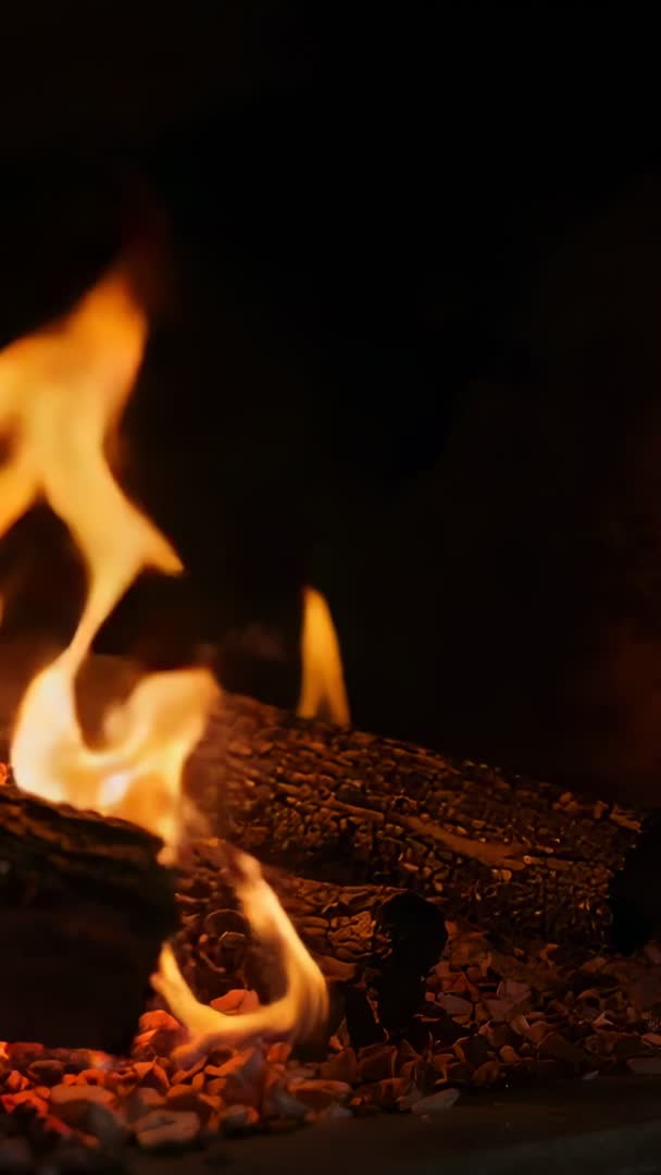 AI Generated Video. Showing vertical close-up of burning logs, embers igniting and flames flickering against dark background. Warm amber tones radiating, ember bed glowing with subtle smoke and ash details. Slow-motion capture suiting looping playback, gentle crackle sound adding ambient texture. Working well for holiday promotion, home decor video backdrop, relaxation or meditation clip, social media story, interior design showcase, hotel or restaurant ambience. Working well as transition element in film, background for product display, seasonal marketing, fireplace tutorial, or ASMR content. Color grading leaning warm, high contrast between flames and shadow, strong vertical composition optimized for mobile-first platforms.