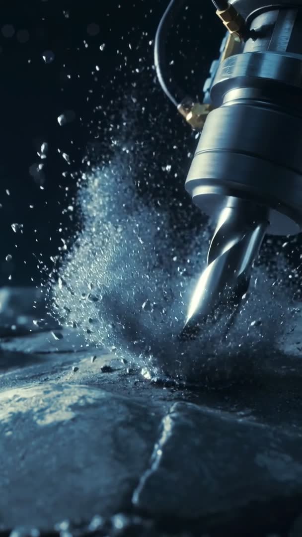 AI Generated Image. Featuring dramatic close-up of CNC endmill machining cracked metal while coolant spraying and metal chips flying. Capturing high-speed machining action, spindle motion, and coolant mist for industrial and engineering visuals. Ideal for manufacturing marketing, machine tool demonstrations, technical training, shop floor safety briefings, website hero backgrounds, and mobile social ads. Vertical orientation optimized for mobile platforms and social stories. Providing copy space on left for overlay text, logos, or captions. Suitable for looping as dynamic background in presentations, product promotions, and editorial segments about precision machining, toolmaking, and production workflow. Emphasizing texture of metal surface, cutting dynamics, and coolant interaction for technical storytelling.