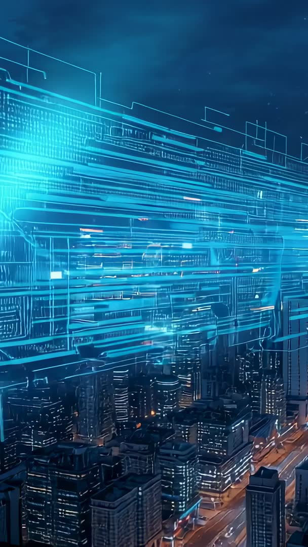 AI Generated Image. Scene showing cyan hologram data stream sweeping over night city skyline, sending rhythmic neon pulses across skyscrapers and streets. Serving as vertical video opener for tech product launches, cybersecurity explainers, app demos, and sci-fi trailers. Providing dynamic background for social stories, mobile ads, conference intros, and broadcast bumpers. Palette focusing on cyan and deep blue with neon highlights, featuring medium-fast pacing and loop-friendly stream for seamless 9:16 use. Helping convey themes of connectivity, speed, urban innovation, and digital transformation while supporting overlays for logo, title, and motion text.