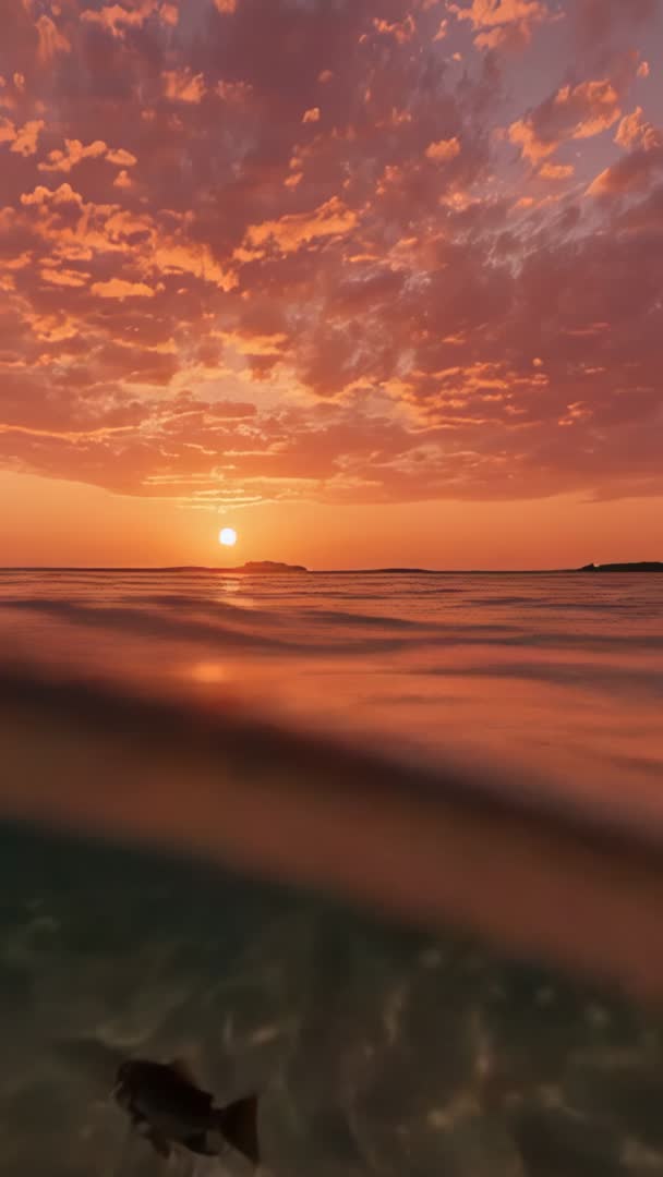 AI Generated Video. Vertical slow-motion clip showing dark fish gliding over shallow seabed during golden sunset with glowing clouds and warm orange reflection on water. Composition balancing calm surface and underwater foreground, creating minimalist and meditative mood. Suitable for social media reels, Instagram stories, TikTok videos showcasing travel, nature, relaxation, ocean conservation campaigns. Useful as background for wellness apps, guided meditation sessions, hotel and resort promos, tourism websites, environmental documentaries, cinematic title sequences. Color palette emphasizing warm tones and contrast between silhouetted fish and illuminated sky. Clip working well for looped banners, vertical ads, calming transitions in video projects, or hero headers on mobile sites. Vertical orientation and shallow depth of field creating immersive foreground motion; slow panning or subtle color grading enhancing mood. Licensing tip: select extended license for commercial broadcast or large-scale displays.