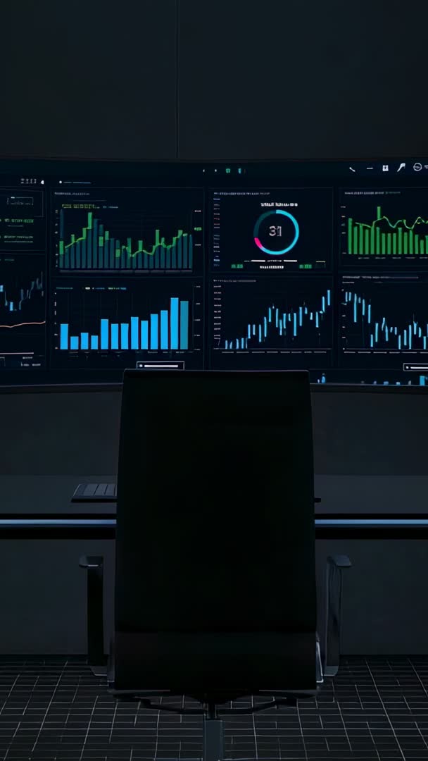 AI Generated Image. Vertical footage showing empty control chair facing multi-screen dashboards updating real-time analytics, gauges and charts. Dark high-tech workspace mood featuring blue and green data visualizations highlighting trends, spikes and KPIs. Footage suiting use in technology presentations, cybersecurity promos, financial services ads, industrial automation campaigns, corporate reports and social media vertical ads. Clip supporting scenes for network operations center demonstrations, trading floor simulations, executive dashboard walkthroughs, product demos and broadcast lower thirds. Composition offering large negative space above displays for overlaying text, logos and call-to-action graphics. Color palette and motion allowing easy integration with motion graphics and soundtrack choices. Delivery format vertical 9:16, ideal for mobile and social platform content and app previews.