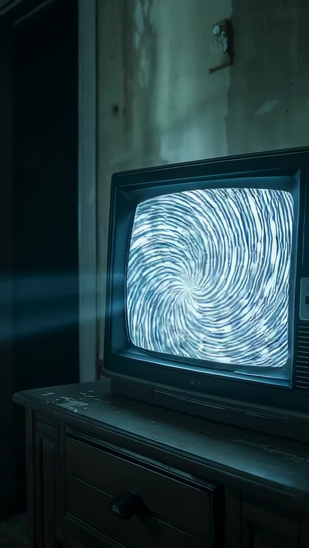 - Vertical video displaying CRT TV emitting hypnotic swirling static in decaying room