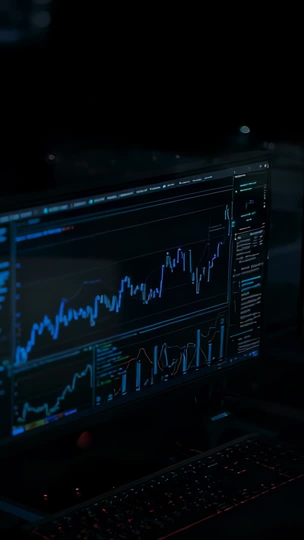 AI Generated Image. Video showing close-up of trading monitors receiving real-time market data, displaying candlestick charts, volume bars, moving averages, and technical indicators. Dark moody blue lighting with backlit keyboard creating high-tech atmosphere and focused workflow. Working well for finance and trading projects, fintech app promos, market analysis segments, cybersecurity campaigns, corporate presentations, social media vertical ads, mobile app backgrounds, and news clips. Editing suggestions: apply slow zoom or parallax for dynamic motion, loop clip for ambient background, add animated lower thirds for ticker details, overlay headlines or call-to-action text. Sound suggestions: low electronic pulse, ambient synth pads, subtle key clicks for tech feel. Color grading tips: enhance contrast, boost blue and teal tones for cohesive cyber look. Use in product demos, pitch decks, educational videos on trading strategies, market commentary, and website hero banners.