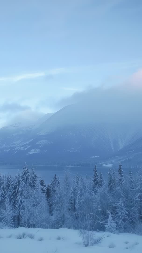 AI Generated Video. Vertical video showing drifting low clouds masking mountain peak above snow-covered conifer forest while dawn tinting sky with soft pink and blue hues. Foreground offering snow-laden pines leading to calm inlet and mist-filled valley, creating layered depth and strong sense of scale. Slow, cinematic motion generating tranquil, meditative mood ideal for ambient backgrounds. Use for travel and tourism promos, winter resort advertising, nature documentary openings, meditation and relaxation apps, social media vertical stories, website hero loops, seasonal greeting videos, calming screensavers, and atmospheric B-roll for weather or outdoor lifestyle segments. Leave upper portion of frame free for headline or logo placement thanks to ample negative space. Recommend gentle color grade to enhance dawn pink highlights and pairing with ambient music or soft piano for maximum emotional impact.