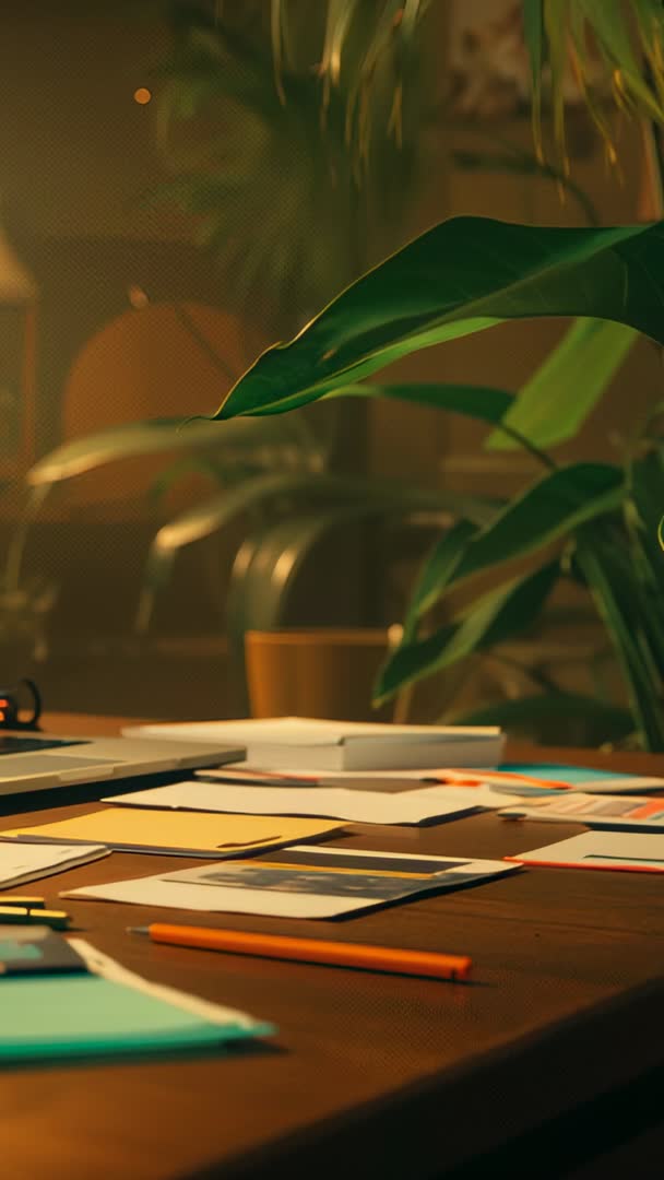 AI Generated Video. Vertical clip showing drifting green leaf crossing wooden desk in cozy home workspace. Foreground leaf creating natural frame while soft warm light bathing desk surface and laptop, scattered papers, notebooks, pencil adding productive mood. Shot using shallow depth of field and warm color tones, creating calm organic atmosphere and subtle bokeh highlights. Use for background B-roll in remote work videos, social media reels, vertical ads, app intros, wellness or mindfulness content, interior design showcases, and lifestyle branding. Recommend slow motion loop or gentle parallax for smooth mobile viewing, adding ambient nature sounds or soft piano for mood, and placing overlay text or logo in upper third for promotional use. Suitable for blogs and campaigns about productivity, plant care, sustainable design, creative workspaces, and home office styling.