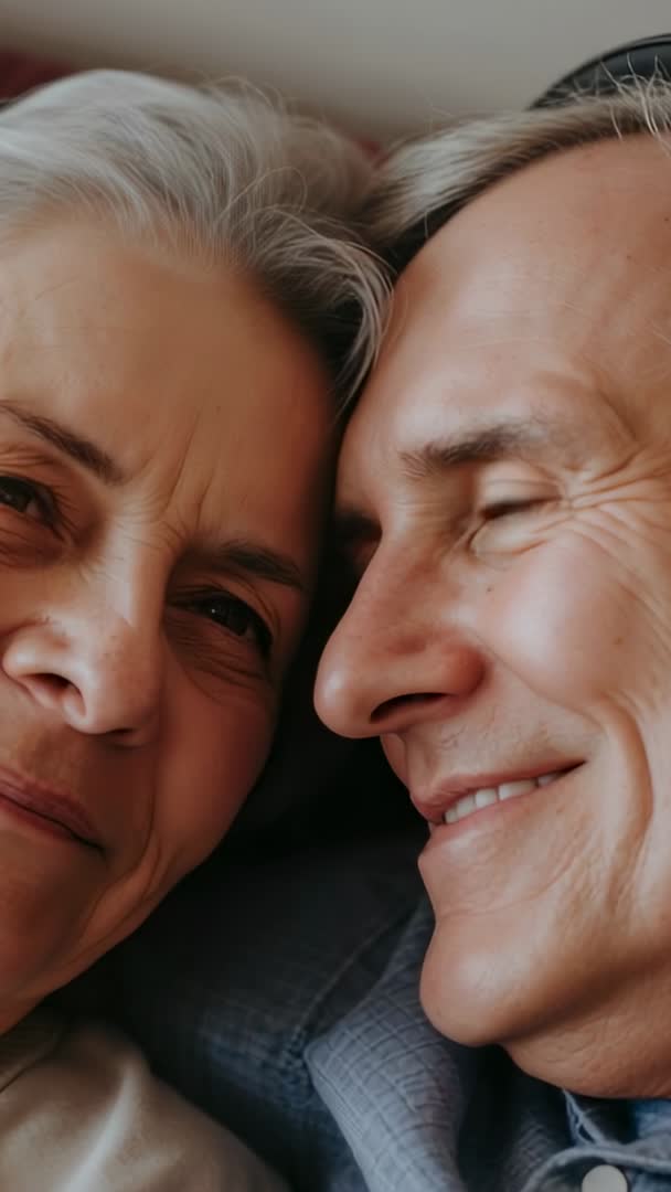 AI Generated Video. Close-up vertical video capturing elderly couple reclining on sofa, sharing intimate eye contact and gentle smiles. Warm soft lighting highlighting facial lines and expressions, conveying long-term companionship, trust, and quiet joy. Camera tightly framing faces for personal, immersive feeling, making clip ideal for mobile-first storytelling. Suggested uses include social media reels, TikTok and Instagram Stories, elder care campaigns, retirement community websites, healthcare marketing, relationship and family articles, anniversary or Valentine content, testimonial segments, and wellness presentations. Editing notes include using gentle crossfade and ambient music, keeping crop-safe composition for vertical mobile displays, and adding on-screen text or voiceover for messaging. Mood palette leans warm, cozy, affectionate, and calm, suitable for promoting care services, senior lifestyle features, or intimate storytelling.