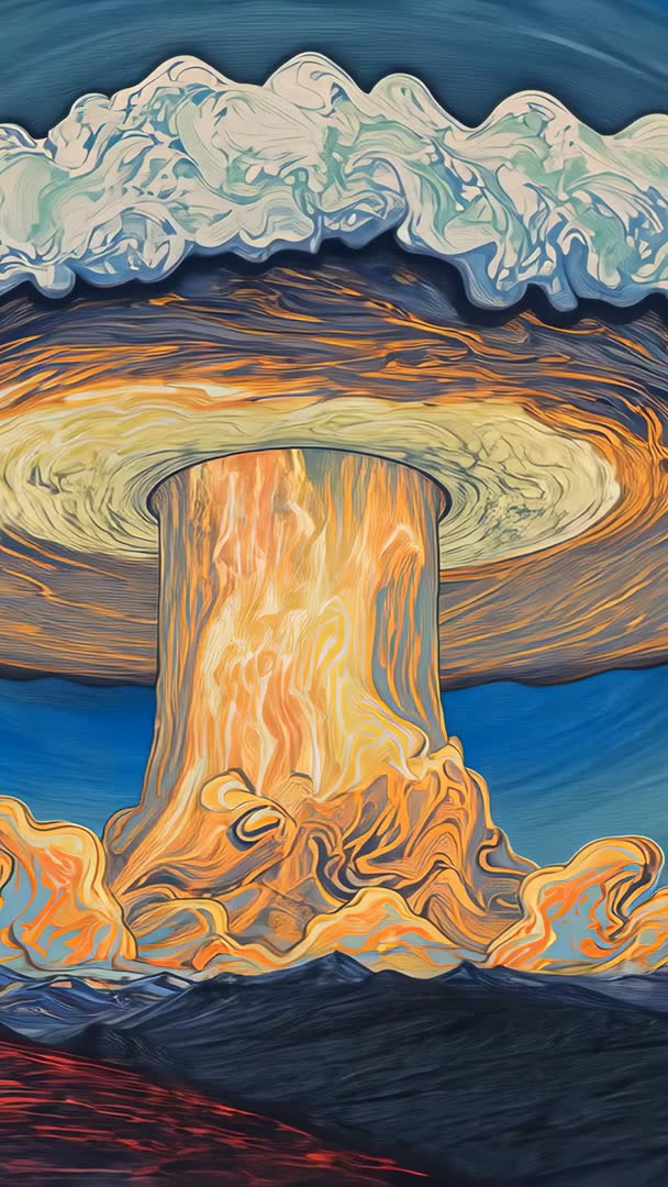 AI Generated Image. Showing erupting mushroom cloud rising from dark ground, feeding billowing cap of smoke and fire with swirling painterly textures. Vertical 9:16 video capturing dramatic contrast between fiery orange core and deep blue sky, delivering cinematic motion and intense color. Ideal for use in disaster awareness campaigns, science fiction trailers, environmental commentary, title sequences, social media reels, and motion graphics projects. Works well as background for dramatic text overlays, album covers, gallery projections, and website hero panels. Clip supporting slow-motion or looped edits for emphasis and visual transitions. Use with deep rumble and synth sound design to heighten impact. Abstract style allowing metaphorical or literal storytelling and easy integration into promotional or editorial content.