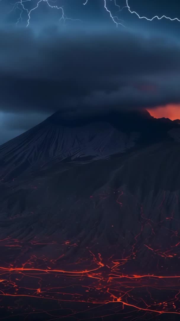 AI Generated Image. Vertical footage showing erupting stratovolcano pulsing glowing lava veins across dark slopes under storm clouds. Lightning illuminating ash plume rising from crater while molten rivers threading through cooled rock. Color contrast between deep blues of storm and intense orange-red of lava creating cinematic mood. Suitable for documentary opener, geological explainer, disaster awareness campaign, cinematic trailer, environmental story, news broadcast, social media vertical ad, mobile wallpaper. Technical notes: vertical 9:16 aspect ratio optimized for mobile and social platforms. Recommended editing: extending slow-motion segments, adding low-frequency rumble and thunder sound design, boosting contrast and saturation for lava highlights, applying cinematic teal-orange grade. Deliverables suggestions: loopable short clips, 4K source, color-graded and raw options for VFX compositing.