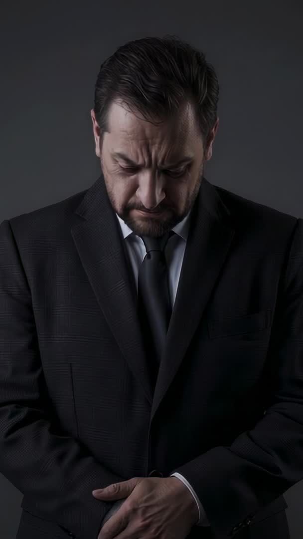 AI Generated Video. Featuring executive bowing head and adjusting cufflink in moody monochrome vertical video. Close-up portrait focusing on expressive brow lines and hands. Lighting creating dramatic shadow and minimal background for strong emotional tone. Useful for conveying contemplation, regret, stress or quiet strength. Ideal for corporate communications, leadership presentations, mental health campaigns, legal or financial drama, obituary or tribute sequences, mobile ads, landing page hero sections, documentaries, podcast covers and B-roll for film or TV. Vertical 9:16 aspect ratio optimizing for mobile-first platforms and social stories. Neutral wardrobe and subdued color palette supporting serious, reflective mood. Suitable for marketing, editorial, corporate training or creative projects needing introspective visual.