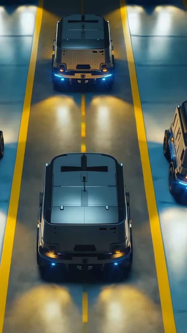 AI Generated Image. Vertical video capturing boxy autonomous vehicles driving down illuminated yellow lanes inside industrial corridor. Overhead framing emphasizing lineup, symmetry, and LED headlight accents. Cinematic lighting creating moody, futuristic atmosphere with reflective floor and strong vanishing lines. Ideal for tech marketing, logistics presentations, startup pitch decks, urban mobility news, and social vertical ads. Use as hero background for website banners, app onboarding screens, conference intros, or product demo videos. Add subtle motion blur, speed ramping, and lower-third text to highlight fleet management features. Color grade toward cool blues and warm ambers to boost contrast and tech aesthetic. Provide optional captions with keywords such as autonomous fleet, last-mile delivery, smart logistics, and industrial automation.